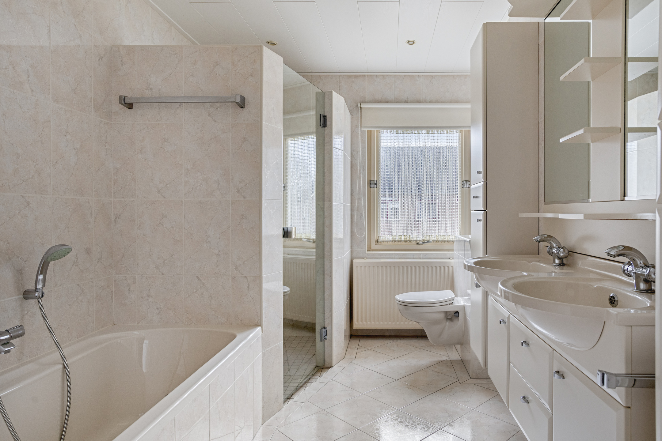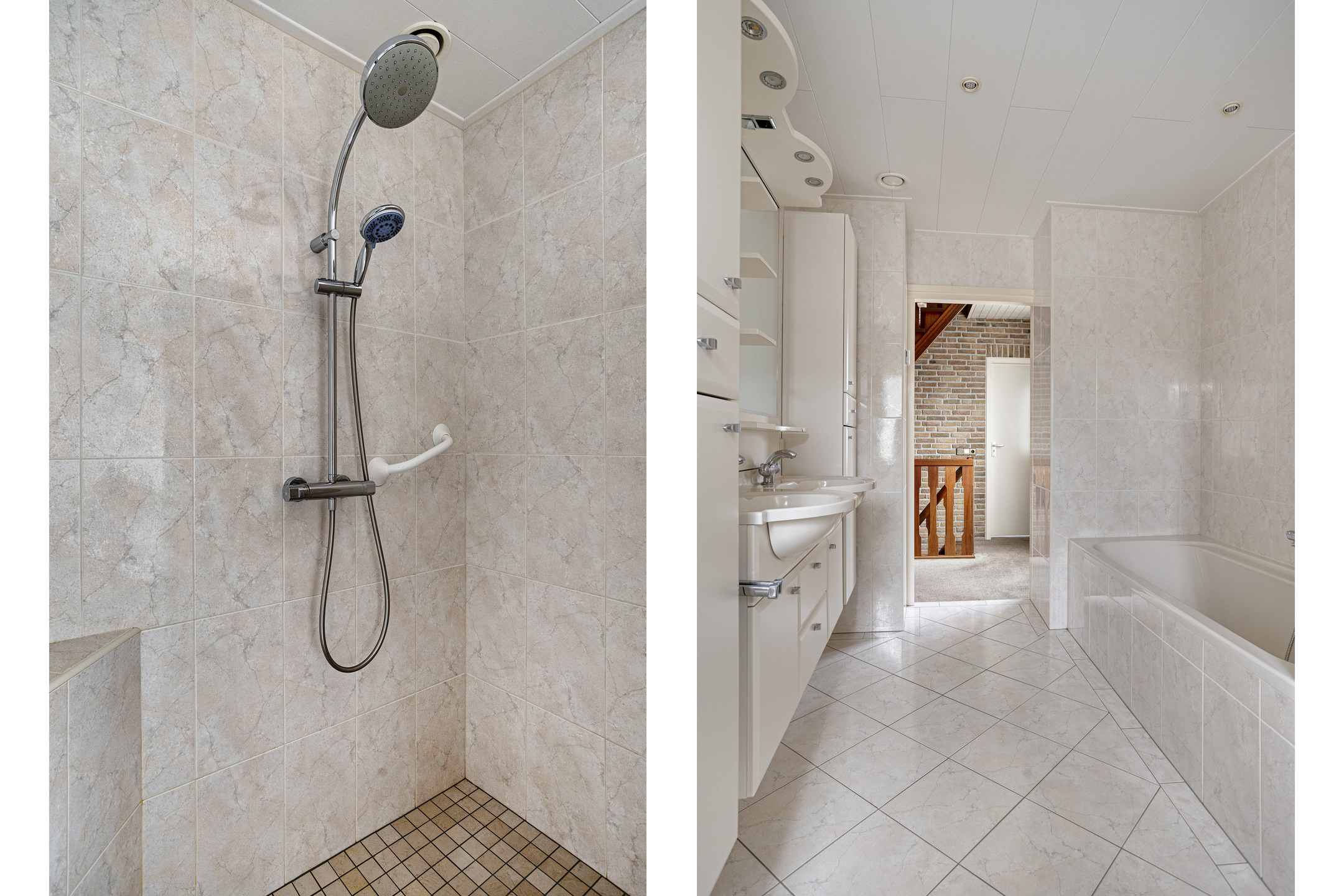 Via de vaste trap in de hal bereikt u de eerste verdieping, waar drie slaapkamers en de badkamer samenkomen. De overloop voelt ruim en overzichtelijk aan en verbindt de vertrekken soepel met elkaar. De drie slaapkamers op deze verdieping zijn opvallend ruim en bieden elk voldoende licht dankzij de grote ramen. Ze liggen allemaal aan de overloop en zijn flexibel in te richten: van slaapkamer tot werkruimte of hobbykamer. Alle kamers beschikken over ingebouwde kastruimte, wat u extra opberggemak geeft. Eén van de slaapkamers heeft bovendien een toegangsdeur naar het platte dak. De volledig betegelde badkamer grenst eveneens aan de overloop en is compleet uitgerust met een douche met glazen deur, ligbad, dubbele wastafel met spiegel, een zwevend toilet en elektrische vloerverwarming. De ruimte verkeert in goede staat en kan desgewenst worden gemoderniseerd naar de stijl die bij u past.