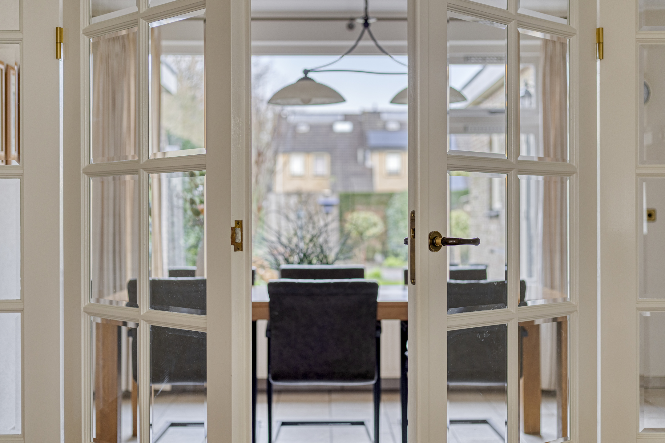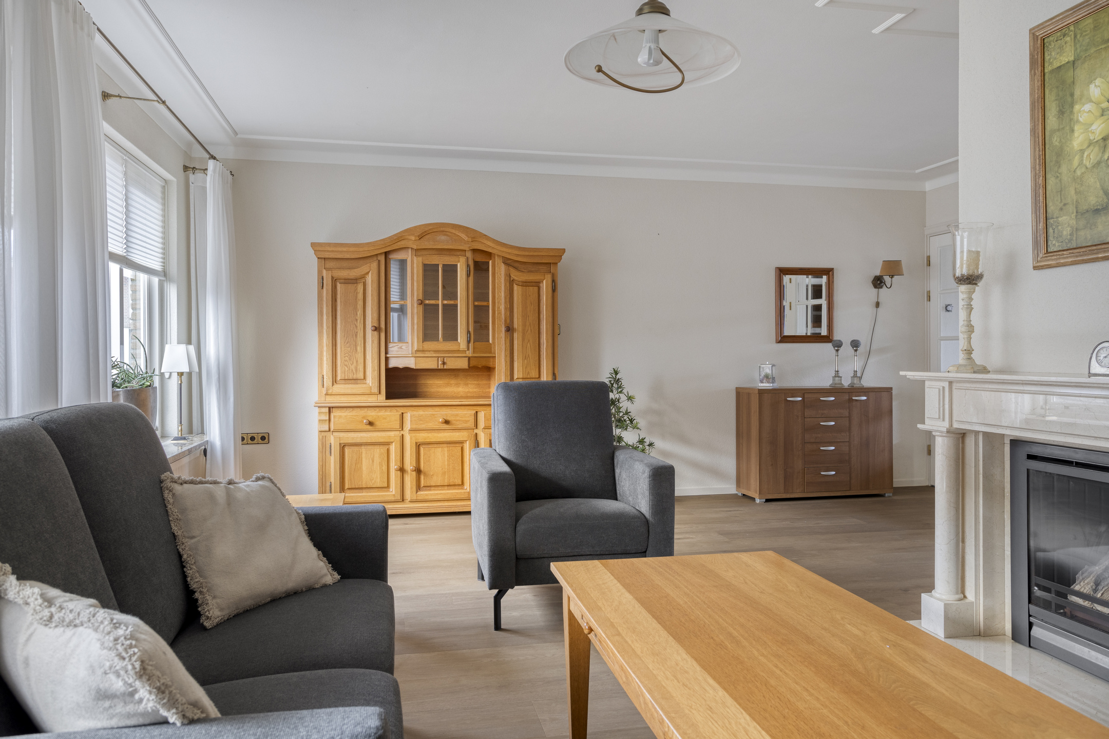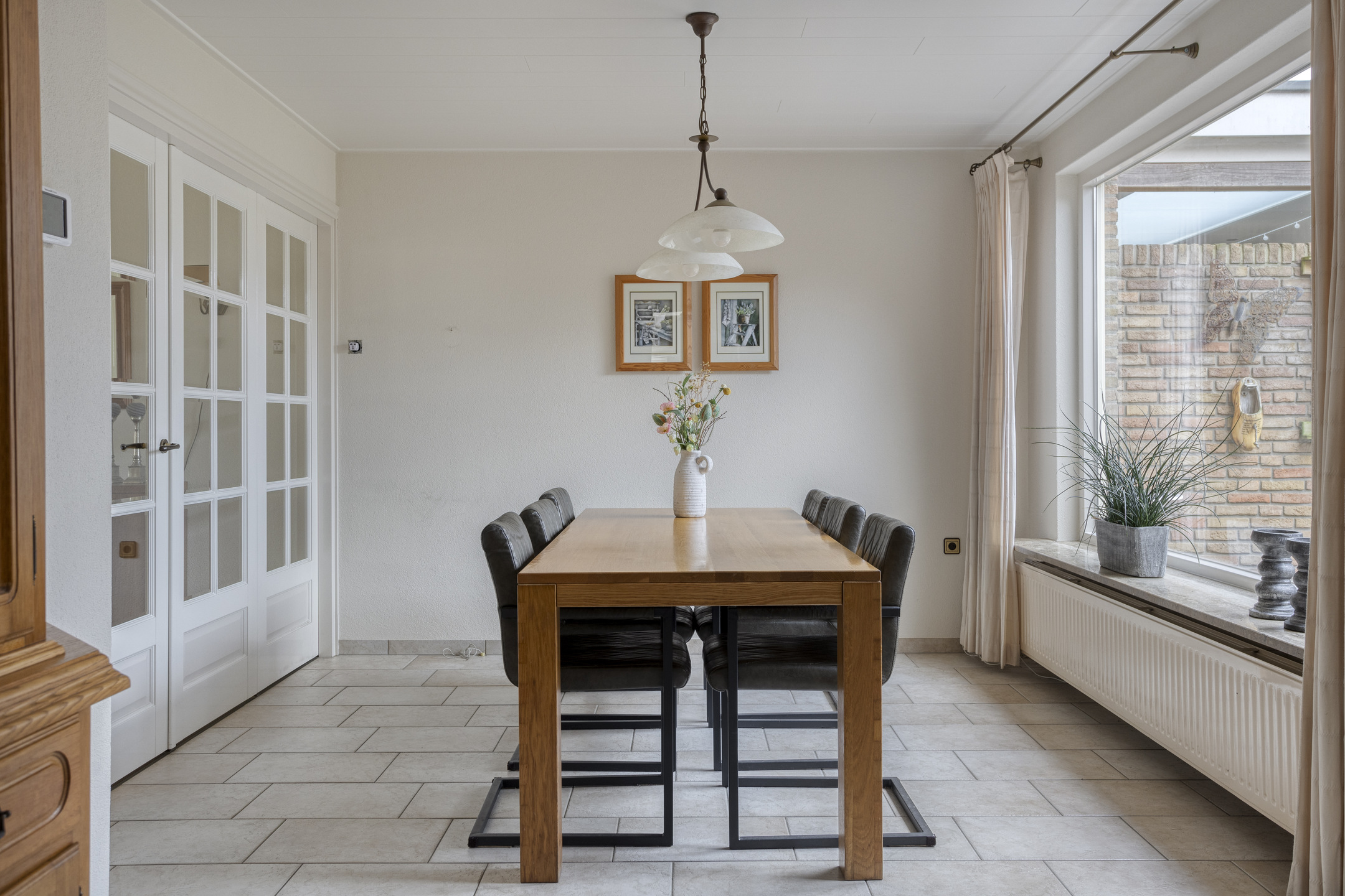 Via de oprit met carport komt u bij de voordeur. Eenmaal binnen betreedt u de hal. De hal vormt de verbinding tussen de verschillende leefruimtes en geeft toegang tot de woonkamer, de toiletruimte en de trap naar de eerste verdieping. Grenzend aan de hal bevindt zich de lichte, open woonkamer waar de grote raampartijen zorgen voor prachtige lichtinval. De indeling biedt plek voor een zithoek. De schouw met haard vormt een ware eyecatcher en zorgt voor warmte in de koude dagen. De eetkamer is middels deuren verbonden met de woonkamer, wat de woning een klassieke en stijlvolle uitstraling geeft. Aan de achterzijde ligt de functionele keuken in praktische L-opstelling, grenzend aan de eetkamer. Hier beschikt u over een lang aanrechtblad, een gasfornuis met afzuigkap, ovencombinatie, spoelbak, koelkast en voldoende kast- en lade-opbergruimte. De keuken is instapklaar, maar biedt ook ruimte om geheel naar eigen smaak te moderniseren. Vanuit de keuken loopt u door naar de bijkeuken, waar u aansluitingen voor witgoed aantreft, een extra toiletruimte én de trap naar de kelder. Ook bereikt u vanuit hier de garage, wat het dagelijkse gemak compleet maakt. De kelder, toegankelijk via de bijkeuken, is ideaal als extra opslagruimte. Hier kunt u voorraad, wijn, seizoensspullen of hobbybenodigdheden handig en koel bewaren.